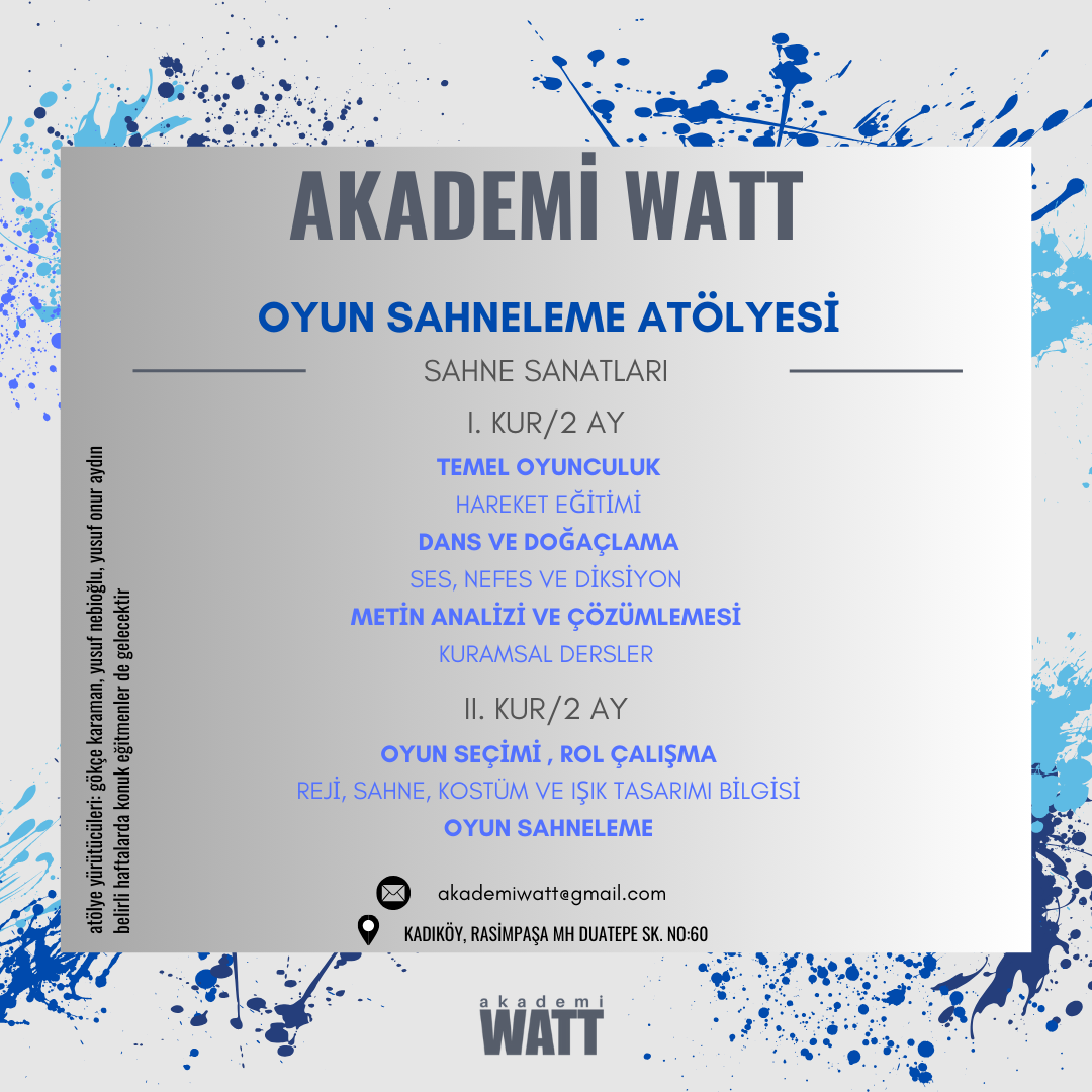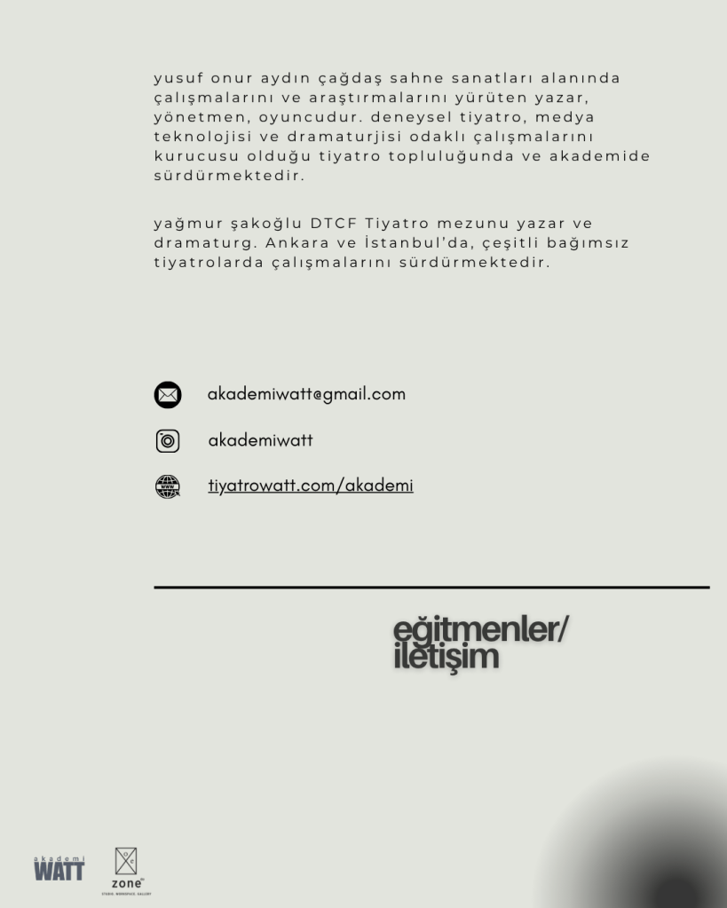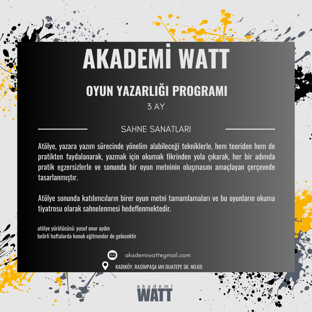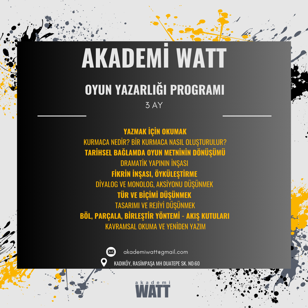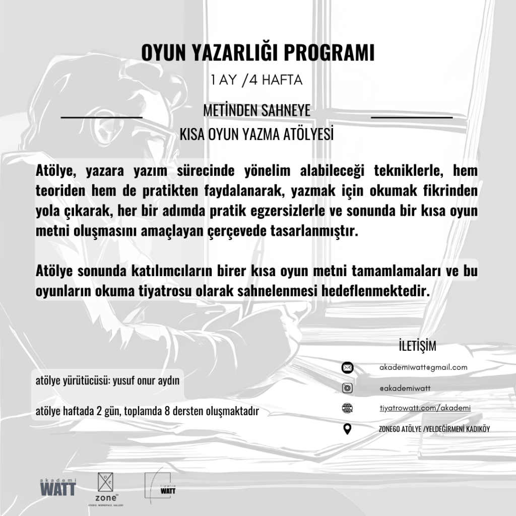 I.MODÜL: (Uzun Program) 3 Ay sürecek atölye, yazara yazım sürecinde yönelim alabileceği tekniklerle, hem teoriden hem de pratikten faydalanarak, yazmak için okumak fikrinden yola çıkarak, her bir adımda pratik egzersizlerle ve sonunda bir oyun metninin oluşmasını amaçlayan çerçevede tasarlanmıştır.