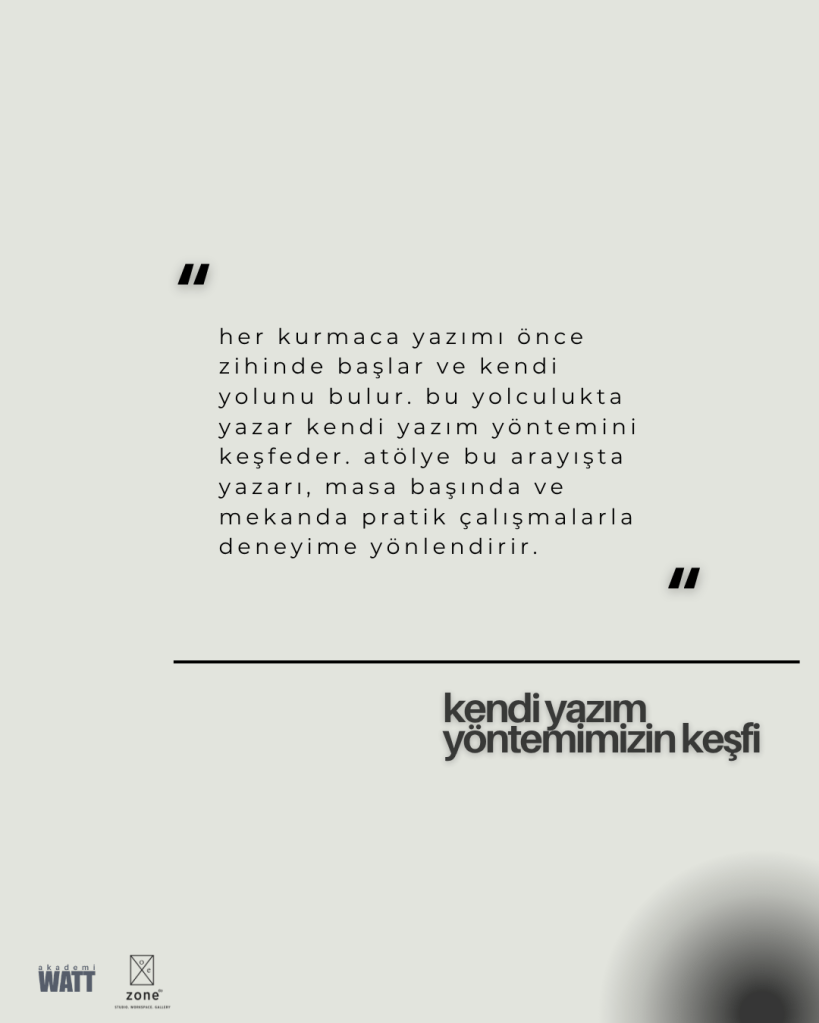 Her yazım süreci önce zihinde başlar ve kendi yolunu bulur. Yazmanın formülü olmadığı fikriyle yola çıkılan bu atölyede, kendi arşiv kutularımızı oluştururken mekan ve beden ile de kendi yazım yöntemimizi arayacağız; bu arayış hem masa başında hem de bedensel aktivitelerle, kişisel deneyim sürecimizi oluşturacak. Kendi bedenlerimiz ve mekan algımızdan yola çıktığımız bu üç hafta, yarattığımız kurmacalarımızda tamamlanacak.